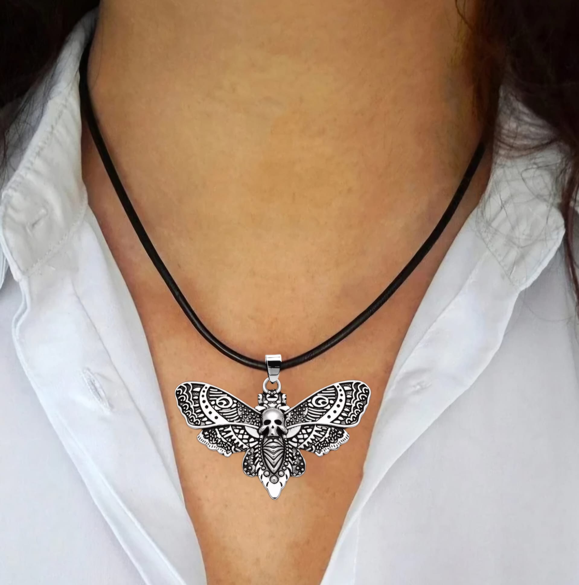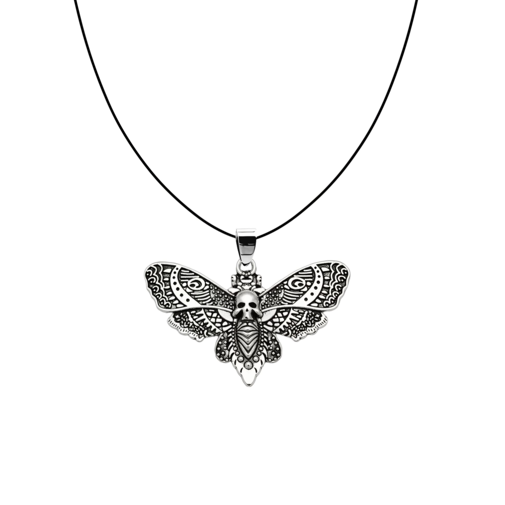 Naszyjnik w stylu gotyckim z zawieszką w kształcie zdobionej ćmy z czaszką w kolorze srebrnym.