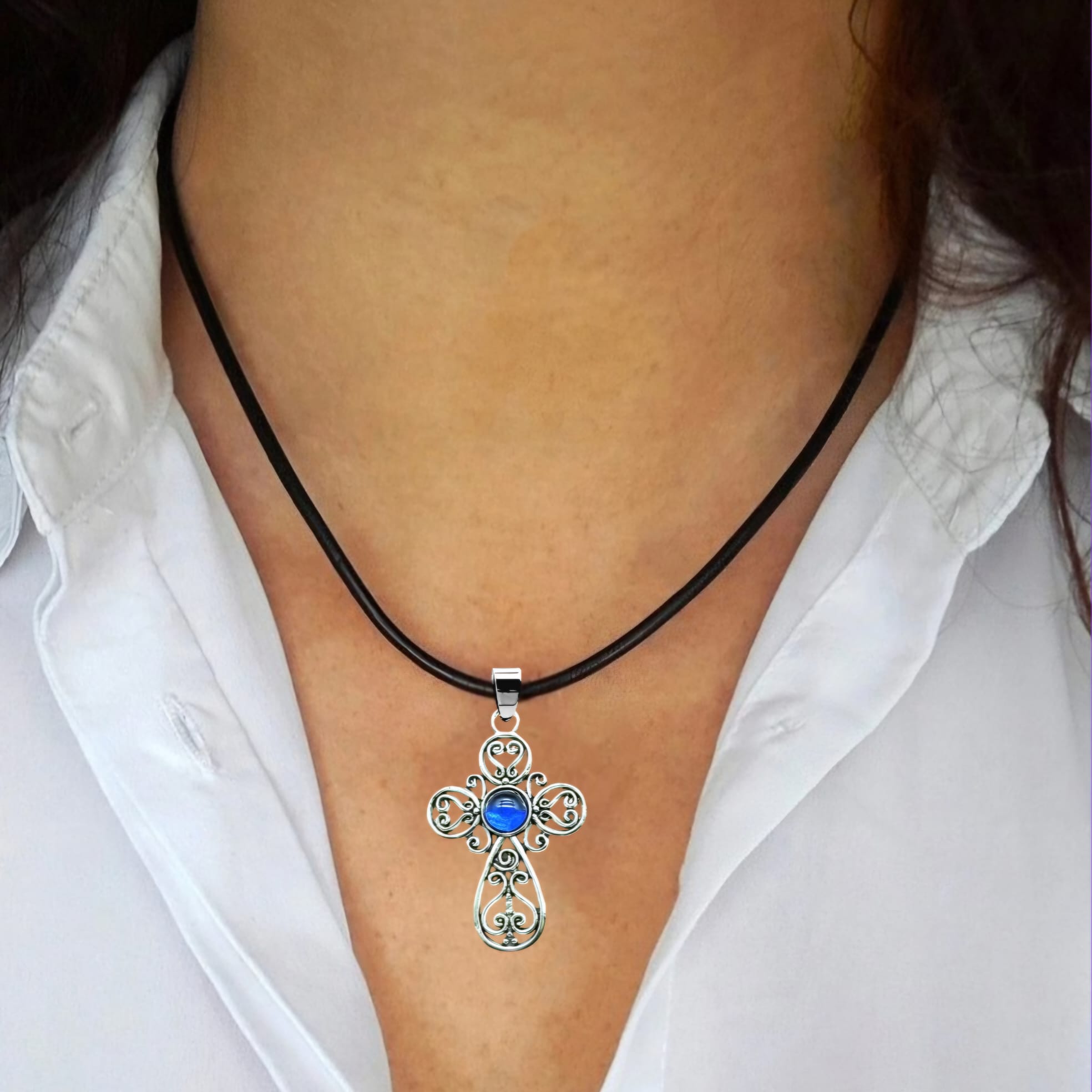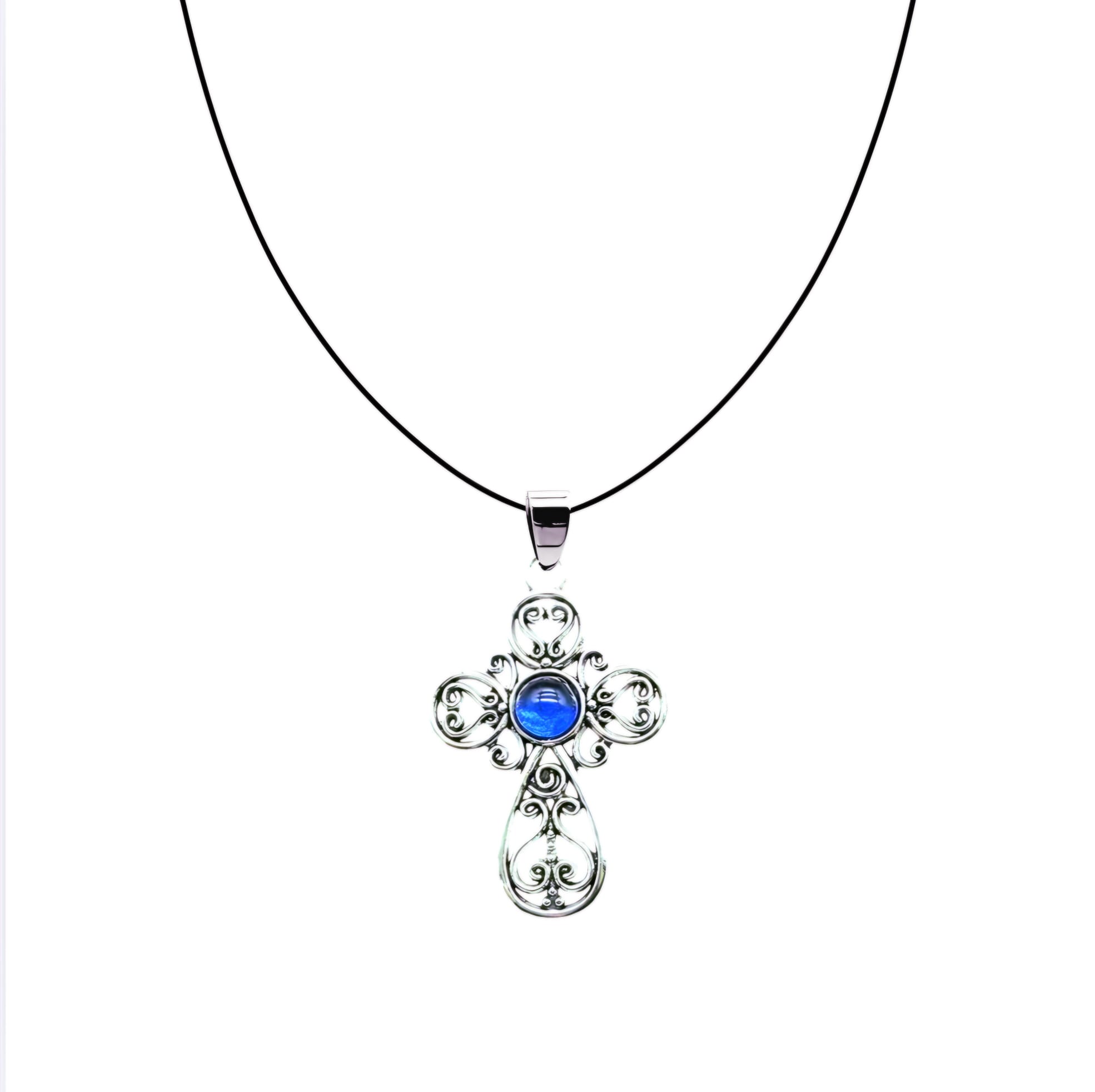 Naszyjnik w stylu gotyckim z zawieszką w kształcie pięknie zdobionego krzyża w kolorze srebrnym z niebieskim oczkiem.