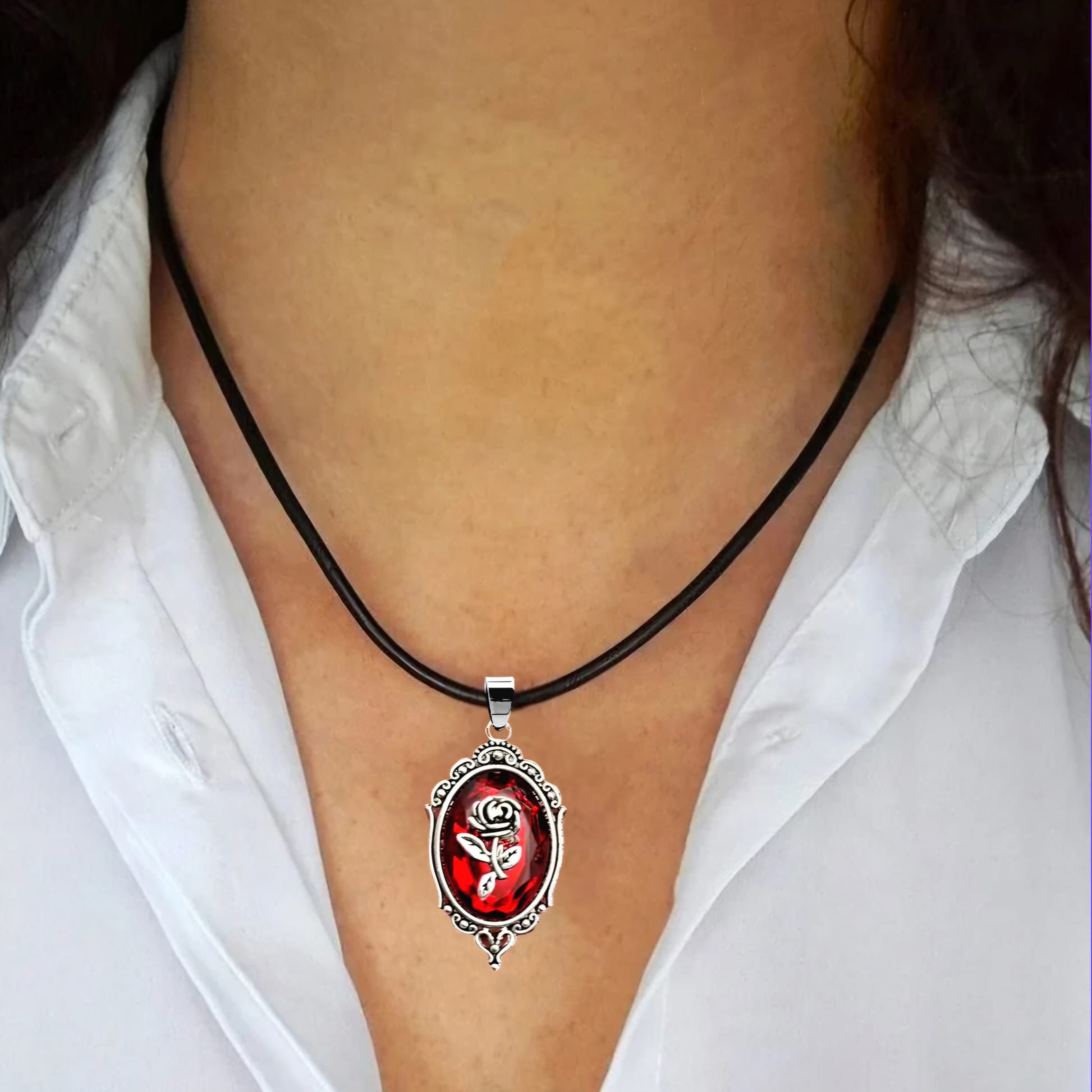 Naszyjnik w stylu gotyckim z zawieszką w kształcie medalionu z różą na czerwonym tle.