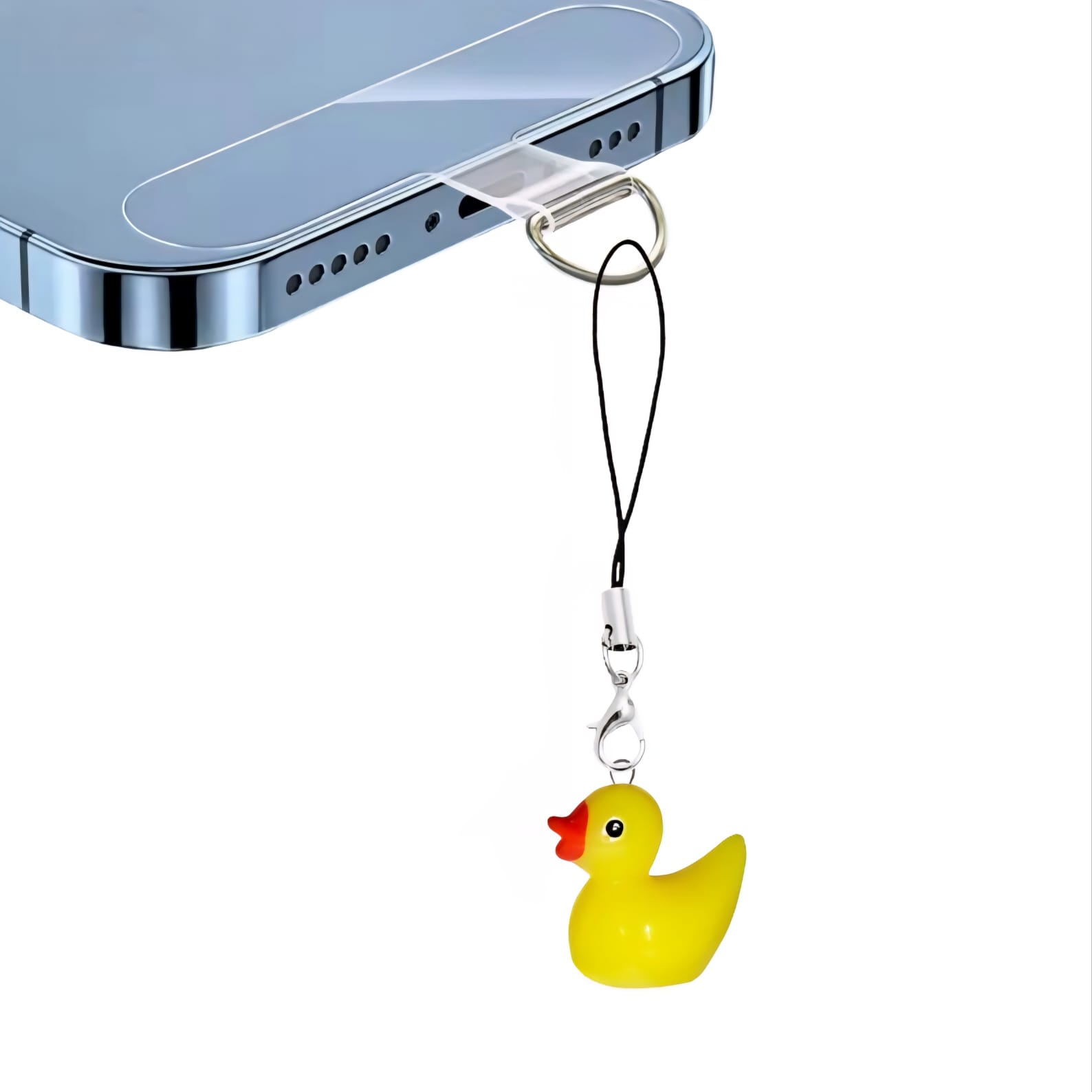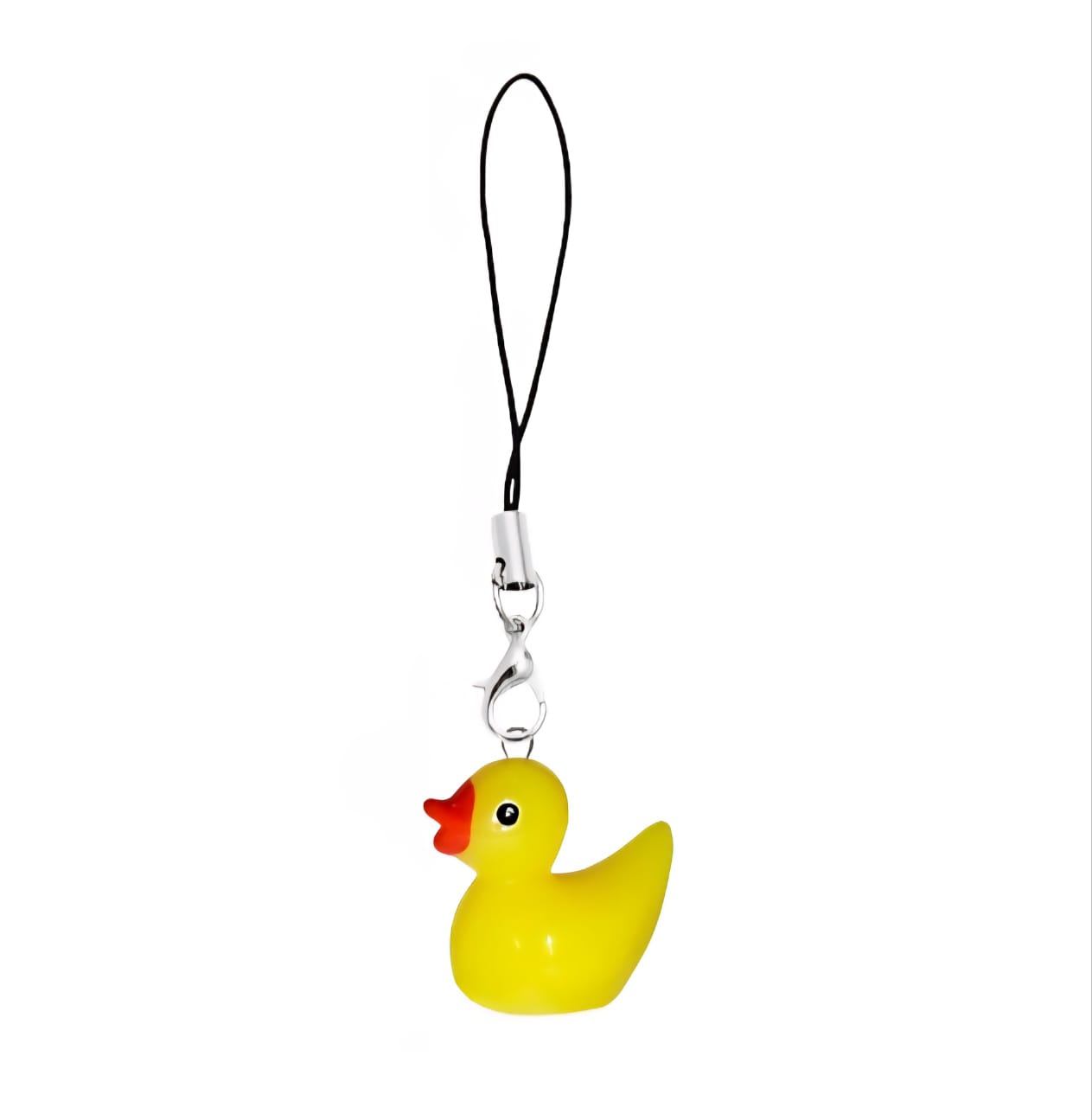 Przywieszka do telefonu z zawieszką przypominającą małą, żółtą kaczuszkę.